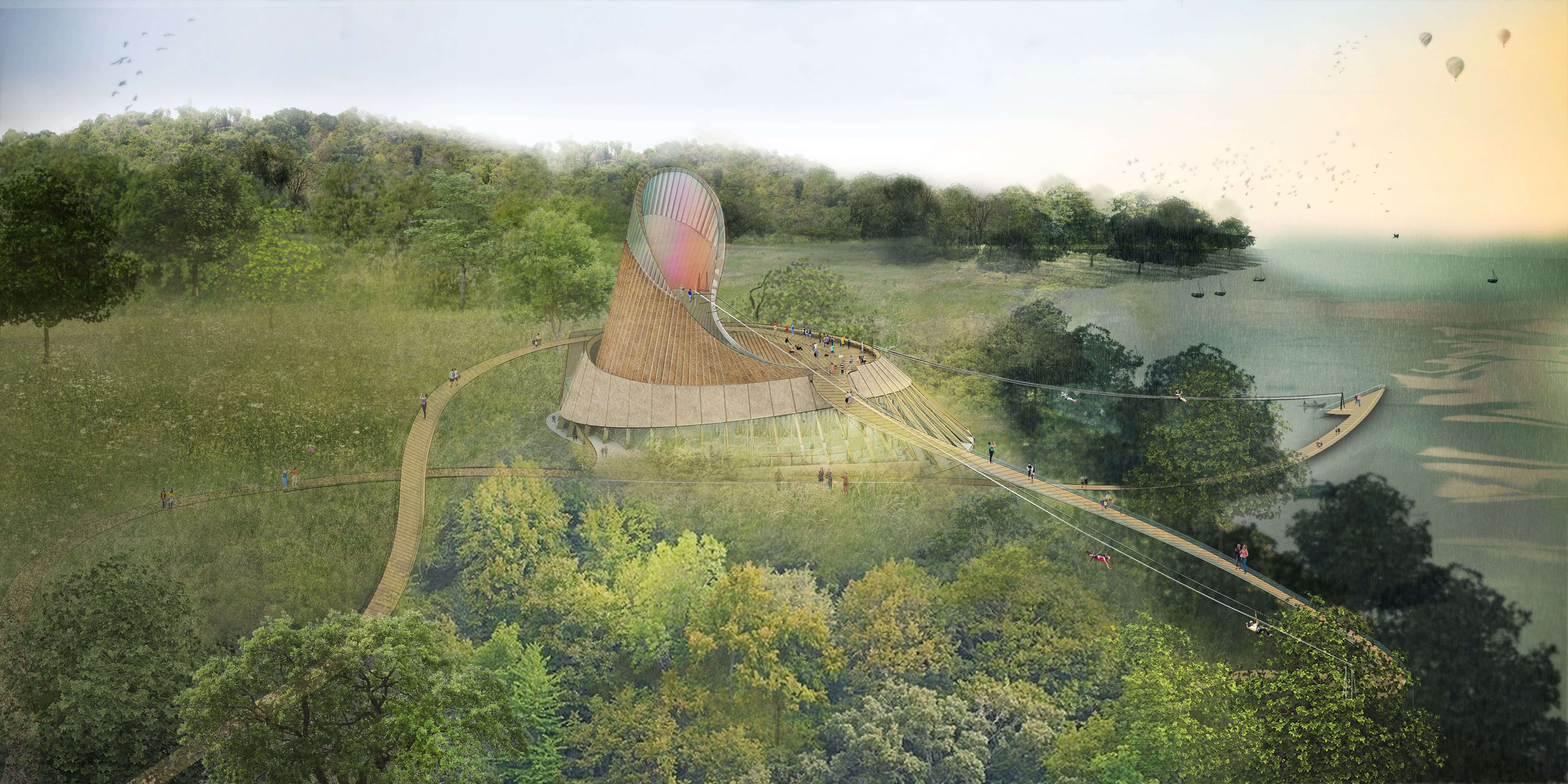 Inside the building would be a performance area and play spaces. Visitors would be able to walk on the roof and take zipwires down to the walkways. The structure would be nestled within the trees and inspired by the forest, with a timber and thatch construction which is light, efficient and low-carbon.